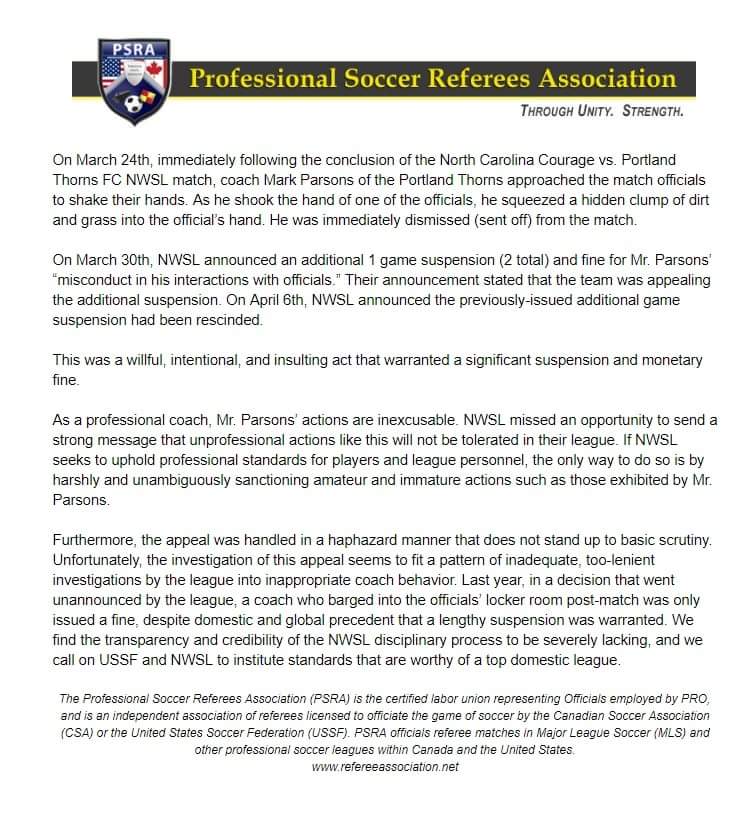 The Professional Soccer Referees Association released a statement Wednesday condemning Portland Thorns coach Mark Parsons for his actions following a match in North Carolina on March 24 and criticizing the National Women’s Soccer League for its handling of the incident.